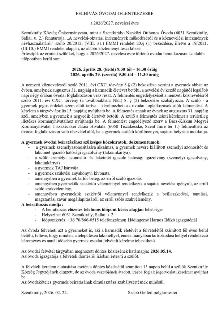 Felhívás Óvodai Jelentkezésre